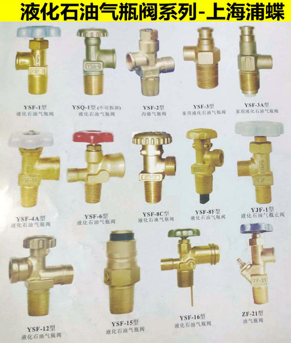 液化气瓶阀,液化石油气瓶阀 阀门类型:液化气瓶阀 阀门型号:YJF,YSQ,YSF 尺寸规格:DN2-25mm 安装形式:螺纹式 压力等级:2.5-25MPa 主体材质:铜,不锈钢304,316等, 产品铭牌:浦蝶 液化气瓶阀,液化石油气瓶阀技术参数图片: