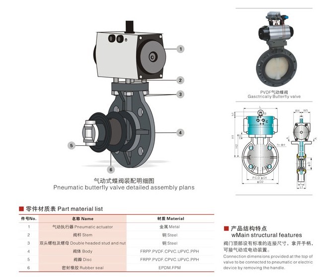 气动塑料蝶阀,气动UPVC塑料蝶阀介绍:气动塑料蝶阀重量轻、耐腐蚀性强,气动塑料蝶阀被应用于多个领域,如一般纯水和生活饮水的管路系统、排水和污水管路系统、盐水和海水管路系统、酸碱和化学溶液系统等多个行业,气动塑料蝶阀品质得到广大用户的认可。气动塑料蝶阀外型结构紧凑美观,本体重量轻容易安装 耐腐蚀性强,应用范围广,材质卫生无毒 耐磨损、容易拆卸,维护简单易。